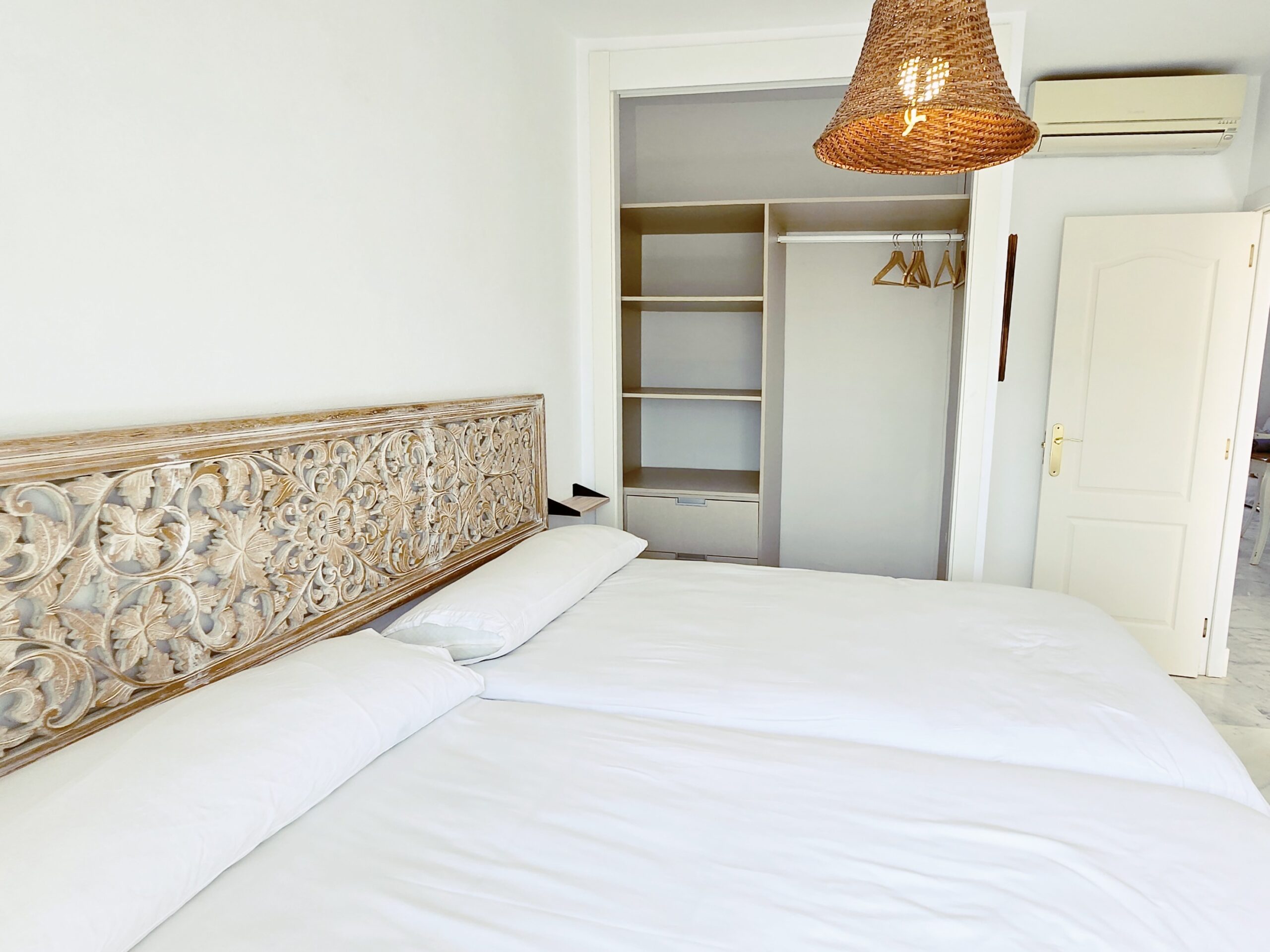 Das Apartment im obersten Stockwerk bietet auf 60 m² Platz für bis zu vier Erwachsene. Es verfügt über zwei Doppelzimmer, beide mit Klimaanlage, Wärmepumpe und Zugang nach draußen. Eines der Schlafzimmer hat ein eigenes Badezimmer.