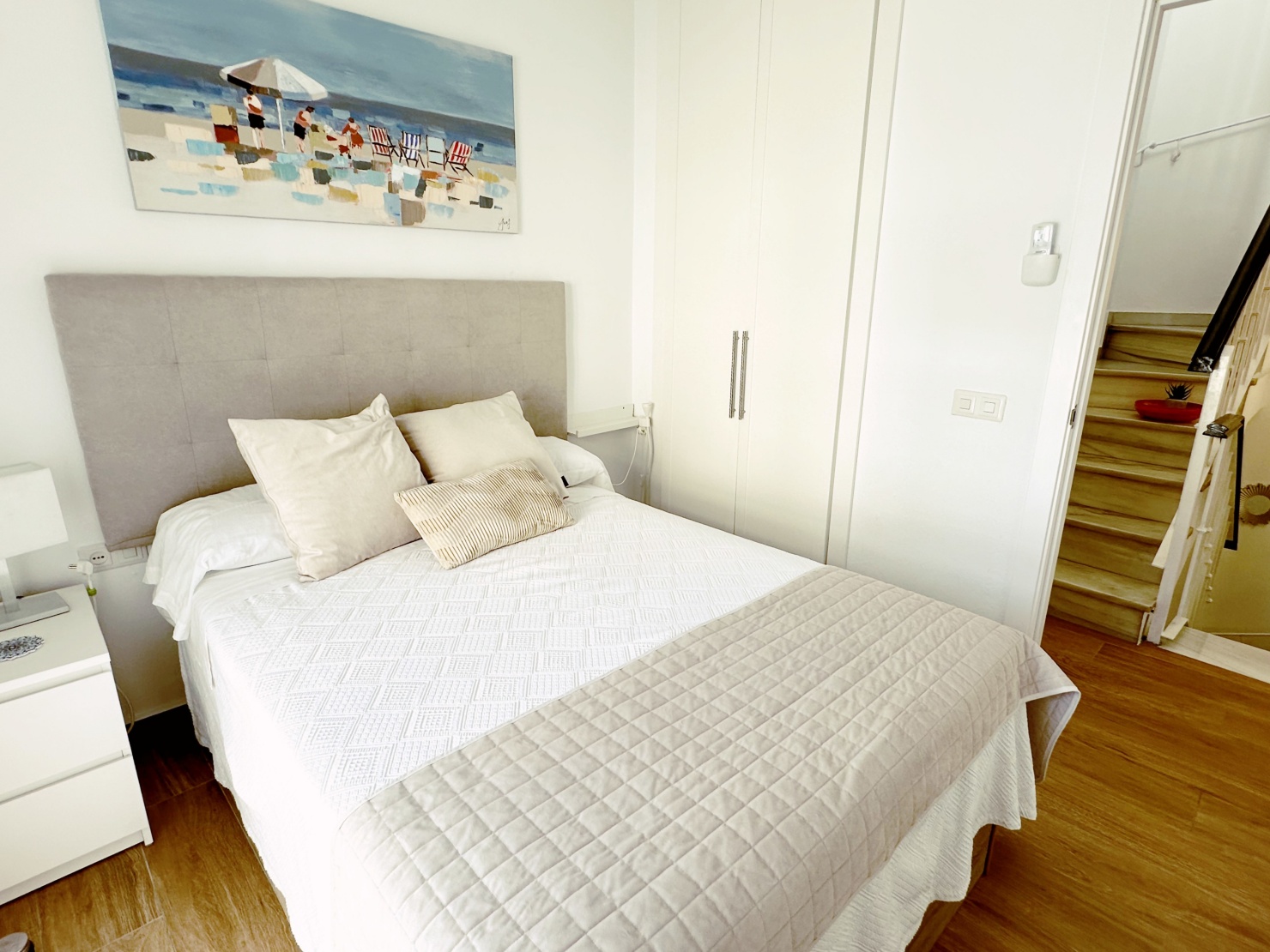 Au premier étage se trouvent les deux chambres, chacune avec un lit double, la climatisation et un balconnet qui apporte lumière naturelle et ventilation. Les chambres partagent une salle de bain complète avec douche, située dans le couloir.